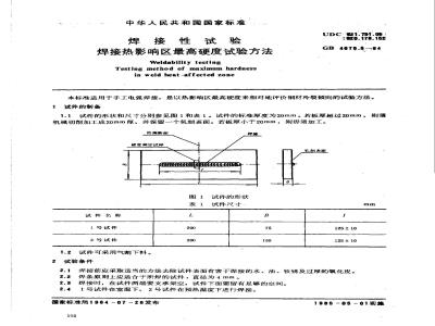 2.1焊接前应采取适当的方法去除试件表面有害于焊接的水、油、铁锈及过厚的氧化皮。2.2焊条原则上应适合于所焊的试件,直径为4mm。2.3焊接时,在试件两端要支承架空,试件下面要留有足够的空间。2.41号试件在室温下,2号试件在预热温度下进行焊接。国家标准局1984-07-28发布