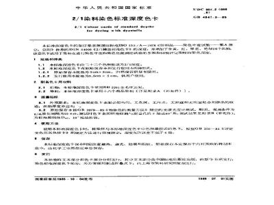 本标准深度色卡的制订是参照国家标准ISO 105/A-1978《纺织品——染色牢度试验——第A部分:总则》推荐的DIN54000《2/1辅助标准色卡》的深度,并增了金黄、红、翠蓝、艳绿四个色相。该套卡适用于染料在进行染色牢度和染色性能测定试验的参照和目视评定染样的染色深度。 GB/T 4841.3-1985 2/1染料染色标准深度色卡 GB/T4841.3-1985 标准下载解压密码:www.bzxz.net