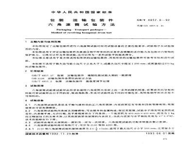 本标准规定了运输包装件进行六角滚筒试验时所用试验设备的主要性能要求、试验程序及试验报告的内容。本标准适用于评定运输包装件在流通过程中所受到的反复冲击碰撞的适应能力及包装对内装物的保护能力。它既可以作为单项试验,也可以作为一系列试验中的组成部分。本标准主要适用于直方体或相似形状的运输包装件,其他形状的运输包装件可参考本标准进行试验。本标准不适用于最大边与最小边尺寸之比大于5,或最大边尺寸超过1200mm,或质量超过270kg的运输包装件。 GB/T 4857.8-1992 包装 运输包装件 六角滚筒试验方法 GB/T4857.8-1992 标准下载解压密码:www.bzxz.net