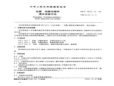 本标准规定了对运输包装进行浸入试验时所用试验设备的主要性能要求、试验程序及试验报告的内容。本标准适用于评定运输包装件承受水浸害的能力及包装对内装物的保护能力。本标准可用于在进行其他各项试验之前的预处理试验。它既可以作为单项试验,也可在作为一系列试验的组成部分。 GB/T 4857.12-1992 包装 运输包装件 浸水试验方法 GB/T4857.12-1992 标准下载解压密码:www.bzxz.net