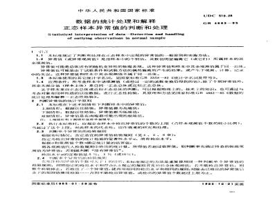 在充许检出异常值个数可大下1的情形,本标准规定的方法是重复使用同一种判断单个异常值的检验规则,即用指定的检出水平和符合2.3规定的规则首先检验全体观测值,著不能检出异常值,则整个检验停止:若检出厂一个异常值,就再用相同的检出水平和相同的规则,对除去已检出的异常值后余下的观测值继续检验直到不能检出异常值,或检出的异常值个数超过上限为止。国家标准局1985-01-29发布