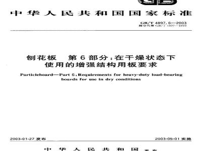 一一第1部分:对所有板型的共同要求;.一--第2部分:在于燥状态下使用的普通用板要求,一第3部分:在于燥状态下使用的家具及室内装修用板要求;:第4部分:征于燥状态下使用的结构用板要求;·一一第5部分:在潮混状态下使用的结构用要求;…第6部分:在于爆状态下使用的增强结构用板要求;二一第7部分:在潮凝状态下使用的增强结构用板要求。本部分为B/T4897花板的第6部分,本部分非等效采用欧洲标准EN312-6:1997《刨花板第6部分:在干燥状态下使用的增强结构用板要求”。理化性能指标除表面结合强度及握螺钉力外,其他与EN312-6相间。尺寸变化检测项目未列人本部分