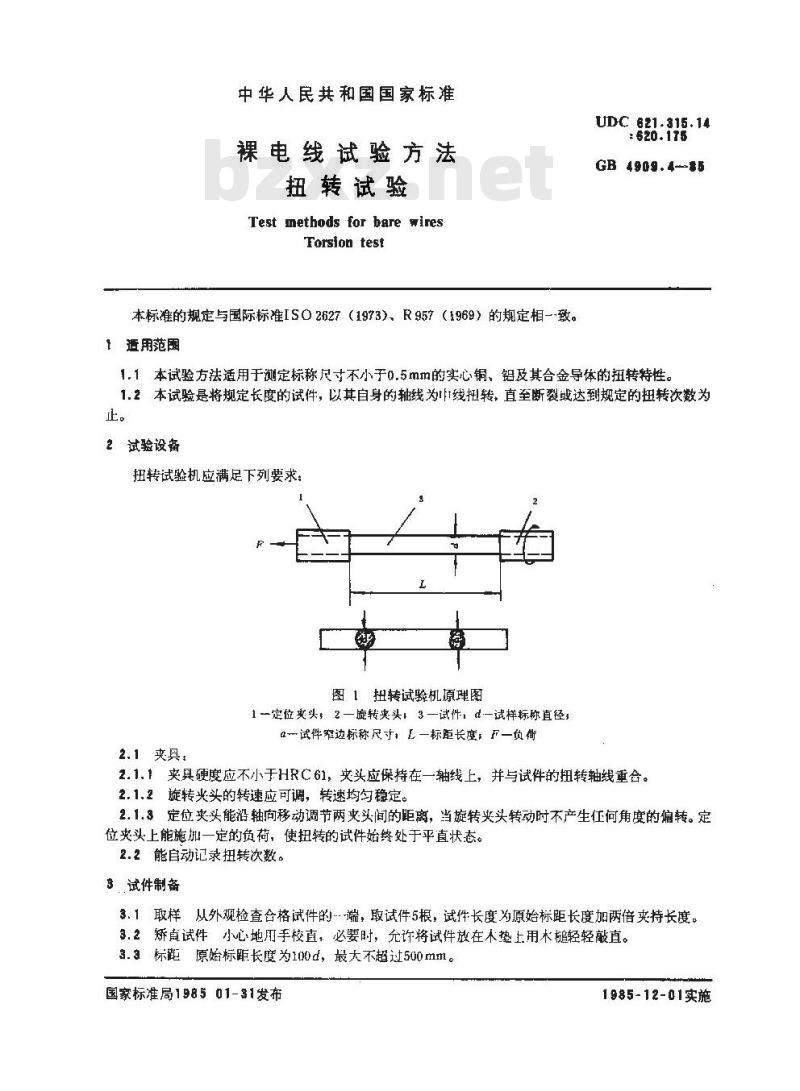 本试验方法适用于测定标称尺寸不小于0.5mm的实心铜、铝及其合金导体的扭转特性。本试验是将规定长度的试件,以其自身的轴线为中线扭转,直至断裂或达到规定的扭转次数为止。 GB 4909.4-1985 裸电线试验方法 扭转试验 GB4909.4-1985 标准下载解压密码:www.bzxz.net