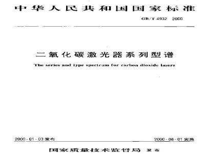 本标准规定了二氧化碳激光器的腔长系列和与之相对应的输出功率系列,同时提出了典型的产品型号;另外还分别规定了起辉[着火]电压、预热时间、输出功率不稳定度和偏振度的系列值。本标准适用于工作波长为10.6μm连续波工作的封离型二氧化碳激光器。本标准不适用于连续波稳频、TEA脉冲及流动式二氧化碳激光器。 GB/T 4932-2000 二氧化碳激光器系列型谱 GB/T4932-2000 标准下载解压密码:www.bzxz.net