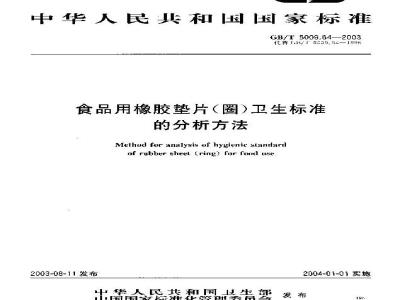 本标准规定了以天然橡胶为主要原料配以一定助剂加工制成的食品用橡胶垫片(圈)的各项卫生指标的分析方法。本标准适用于以天然橡胶为主要原料,按特定配方,配以一定助剂加工制成的,用于瓶装各种果汁饮料、酒、调味品及罐头食品密封的垫片、垫圈等的各项卫生指标的分析。 GB/T 5009.64-2003 食品用橡胶垫片(圈)卫生标准的分析方法 GB/T5009.64-2003 标准下载解压密码:www.bzxz.net