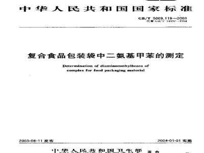 本标准规定了复合食品包装袋中二氨基甲苯的测定方法。本标准适用于复合食品包装袋中二氨基甲苯的测定。本方法的检出限为0.002mg/L。 GB/T 5009.119-2003 复合食品包装袋中二氨基甲苯测定 GB/T5009.119-2003 标准下载解压密码:www.bzxz.net
