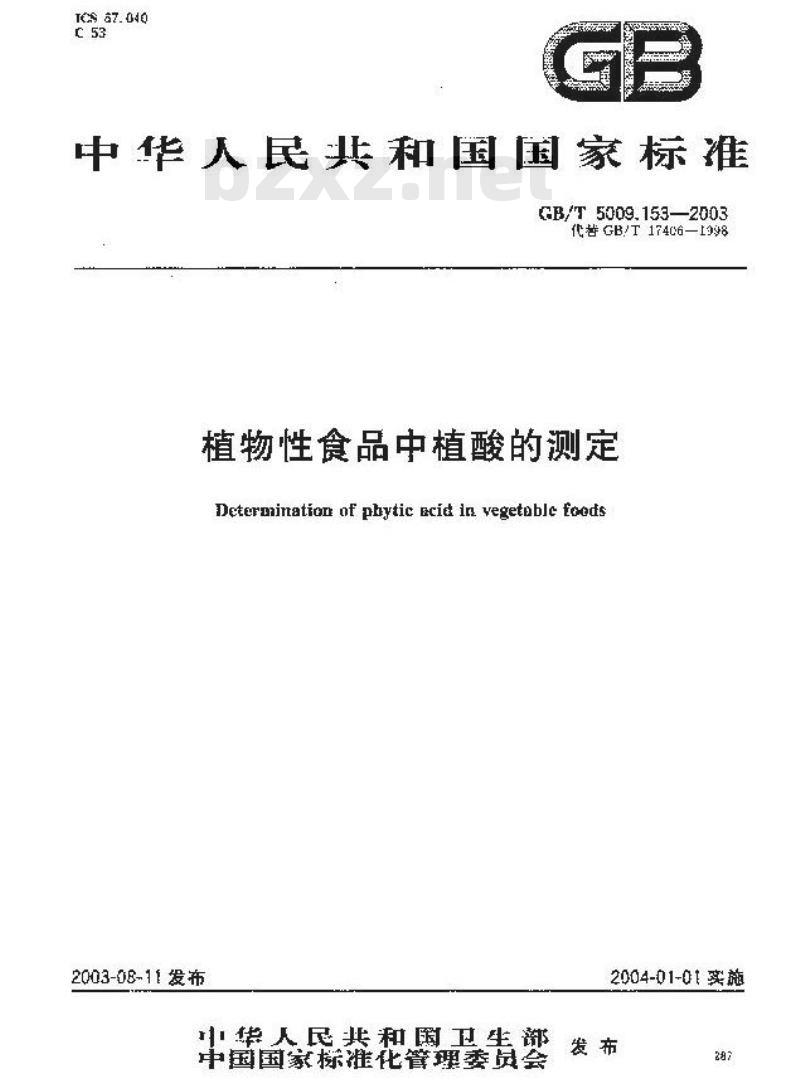 本标准规定了用离子交换分离,分光光度法测定植物性食品中的植酸含量。本标准适用于谷类、豆类、坚果及块茎类植物性食品。 GB/T 5009.153-2003 植物性食品中植酸的测定 GB/T5009.153-2003 标准下载解压密码:www.bzxz.net