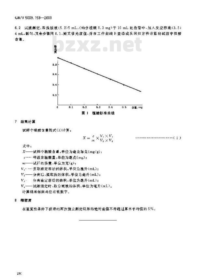 6.2试减测定,取视脱液(5.2)5mL,(约食植酸0.3mg)于1CmL比色管中.加人反应序液(3.5)4血L,解勾,其余步需同6.1.测其强光度值,并在工作曲线上查得或成同归方程计算出试获中拍酸含最、