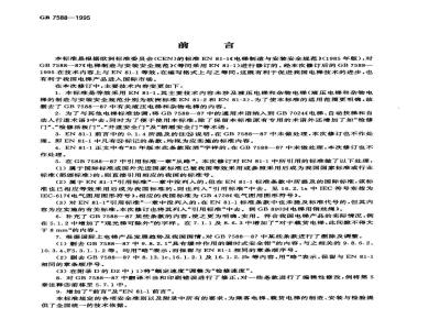 5.在GB7588一87中引用标准一章“从略”。本次修订对EN81-1中所引用的标准做了以下处理:(1)属于国际标准或国外先进国家标准已被我国等效采用或参照采用后成为我国国家标准或行业标准(部颁标准)的,则直接引用相应的我国的标准号。(2)属于EN81-1“引用标准”一章中没列入的,但在EN81-1标准条款中所提及的国际标准,该标准也已相应等效采用后成为我国标准的,则也列入“引用标准”中去。见16.2.1a中IEC符号实指为IEC-617《电气图用图形符号》,相应的我国标准为GB4728《电气图用图形符号》。(3)对EN81-1\引用标准”一章中没列入的,在EN81-1标准条款中也未提及标准代号的,但其内容为应实施的有关标准,本次修订也将其列入“引用标准”中去。例GB8903《电梯用钢丝绳》6.补充了GB7588-87某些条款的内容,使之更为明确、实用。符合我国电梯产品的实际情况,例在5.1.2中增加了“观光梯可除外”的字样。在7.1.1及8.6.3中增加了“对于载货电梯,此间隙不得大于8mm”的内容。