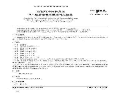 Methods for chemical analysis of ferromolybdenumThe 8-hydroxyquinoline gravimetric methodfor the determination of molybdenum本标准适用于铁量的测定。测定范围:50.00~75.00%。UDC 669.15'28