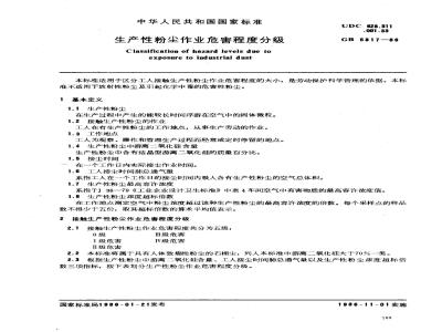 2.2本标准将属于具有人体致癌性粉尘的石棉尘,列人本标准中游离二氧化硅大于70%一类。2.3根据生产性粉尘中游离二氧化硅含量、工人接尘时间肺总通气量以及生产性粉尘浓度超标倍数三项指标,按下表划分生产性粉尘作业危害程度分级。国家标准局1986-01-21发布