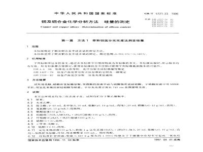 铜及铜合金化学分析方法硅量的测定Copper and copper alloys--Determination of silicon rcontent第一篇方法1萃取钼蓝分光光度法测定硅量本标准规定了铜及铜合金中硅含量的测量方法GB/T 5121.23