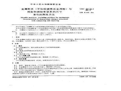 3.1取样:每批至少取足三个压坏数量的验收状态的试验粉。3.2测量模腔尺寸d(直径或长度),精确到0.005mm。3.3按规定的压坏游度或成型压力压制金属粉未或均切混人添加元素(包括润滑剂)的粉未,并测量压坏穴寸dc(直径或长度),精确到0.005mm3.4按规定的烧结条件(时间、湿度雨线和气筑)烧结压还,汁测量其尺寸ds,精确到n.005mma测量烧结试样尺寸应取自测措张还尺的同位置。国家标准局1985-05-08发布