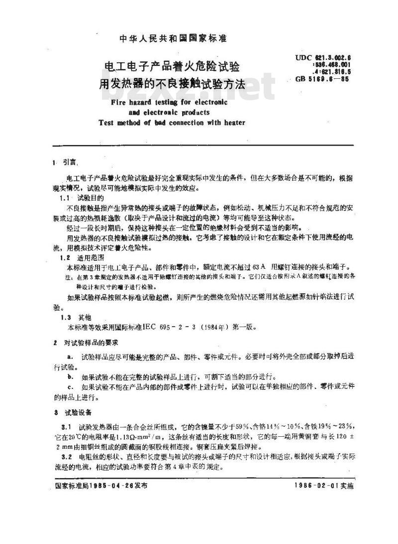 不良接触是指产生异常热的接头端子的故障状态,例如松动、机械压力不足和不符合规范的安装或过高的热损耗逸散(取决于产品设计和流过的电流)等均可能导至这种状态。经过一段长时期后,保持这种接头在一定位置的绝缘材料会受到不适当的影响。用发热器的不良接触试验模拟过热的接触,它考虑了接触的设计和它在额定条件下使用流经的电流,用模拟技术评定火危险性。1.2适用范围