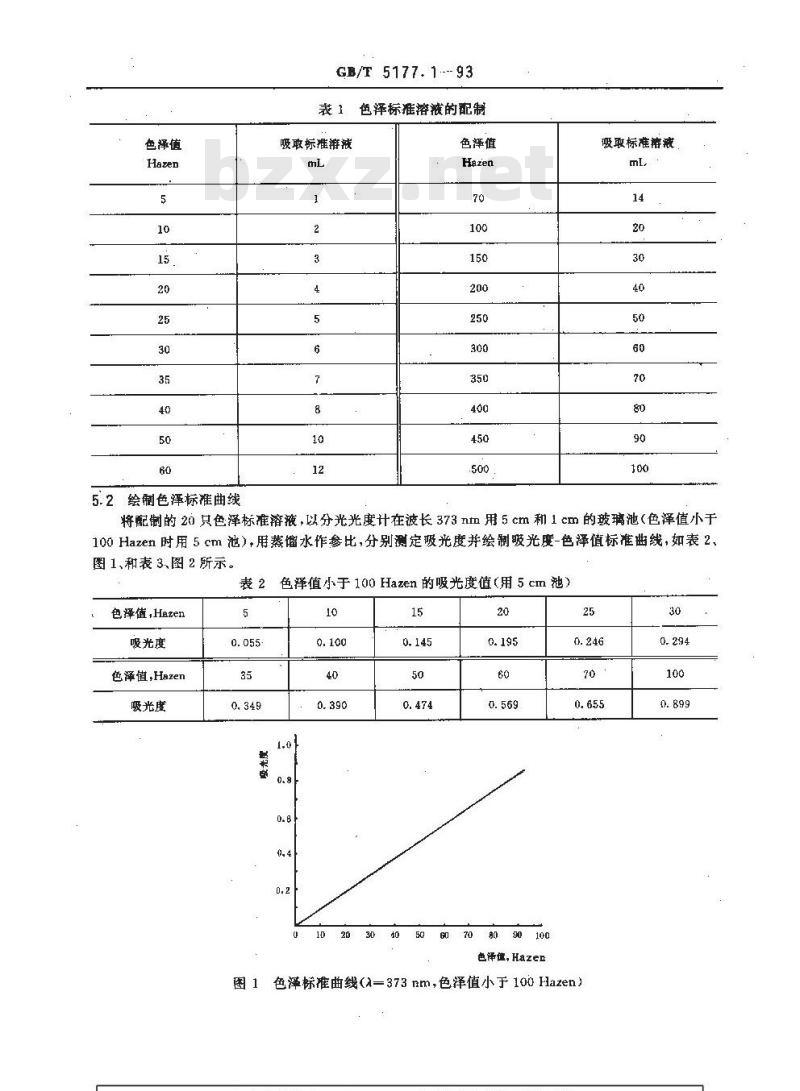 将配制的20只色泽标准溶液,以分光光度计在波长373ntm用5cm和1cm的玻璃池(色泽值小于100Hazen时用5cm池),用蒸馏水作参比,分别测定吸光度并绘制吸光度-色泽值标准曲线,如表2图1、和表3.图2所示、