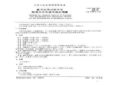 Methods for chemical analysis of fluorsparThe molybdenum blue photometric methodfor the determination of phosphorus content本标准适用于氟石中磷量的测定。测定范围:0.002~0.50%。本标准遵守GB1467一78《冶金产品化学分析方法标准的总则及·一般规定》,1方法提要