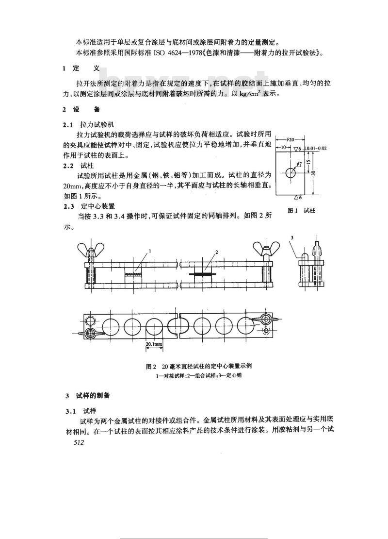 本标准适用于单层或复合涂层与底材间或涂层间附着力的定量测定。本标准参照采用国际标准ISO4624—1978《色漆和清漆——附着力的拉开试验法》。1定义