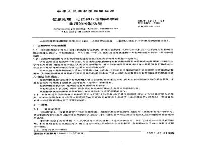 本标准规定了按GB 2311构成的七位代码、扩充七位代码、八位代码或扩充八位代码用的控制功能及其编码表示。本标准规定一个C0集、一个C1集以及由此派生的一些控制功能和若干个单个控制功能。本标准适用的设备有为各种应用而专门设计的设备,由于其应用不同,彼此之间可能有很大的差别。对于一台设备来说,实现本标准规定的所有功能在技术上和经济上是不现实的。对任何一类设备仅实现一些有限选用的适于应用的功能。 GB/T 5261-1994 信息处理 七位和八位编码字符集用的控制功能 GB/T5261-1994 标准下载解压密码:www.bzxz.net