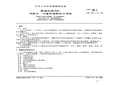 本标准适用于有关电子计算机及信息处理各个领域的设计、生产、维护、使用、管理、科研、教学和出版等方面。 GB/T 5271.14-1985 数据处理词汇 14部分 可靠性维修和可用性 GB/T5271.14-1985 标准下载解压密码:www.bzxz.net