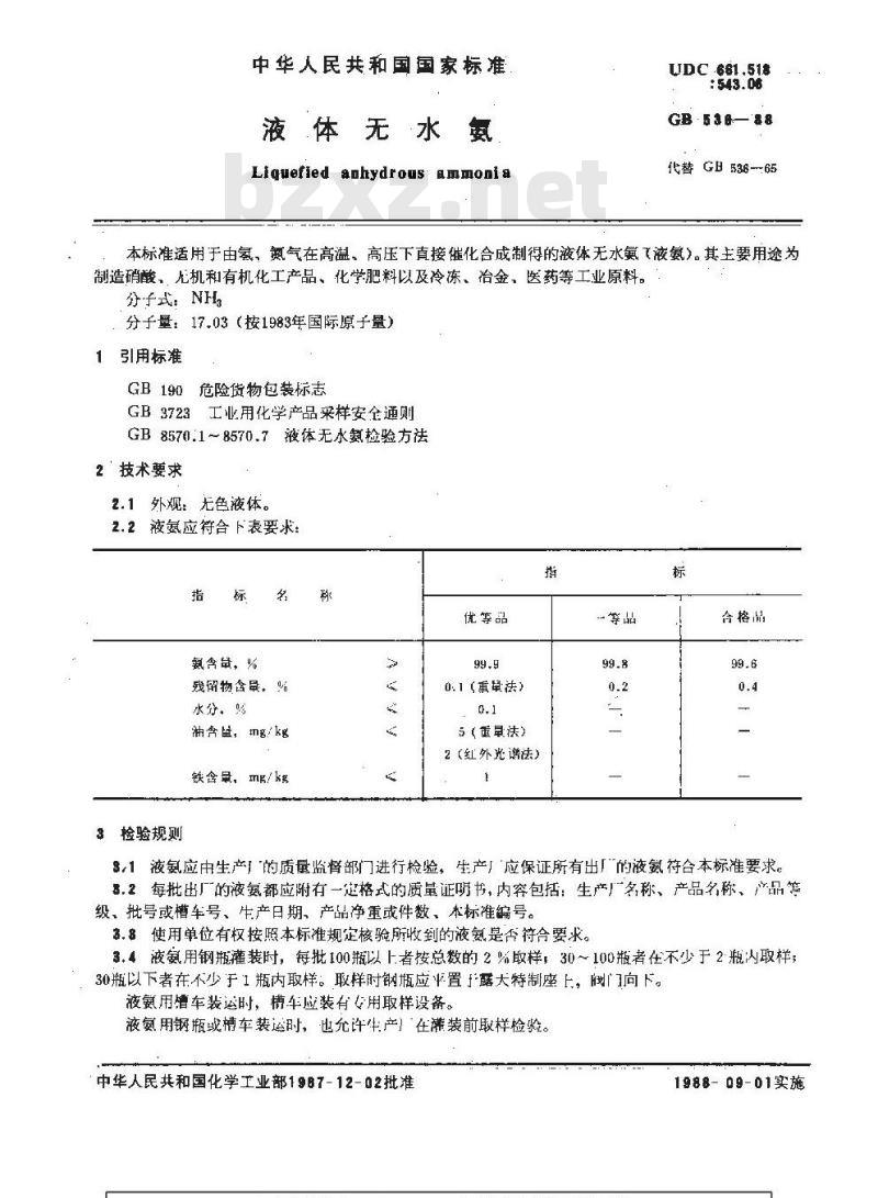 3.1液氨应中生产」的质量监督部门进行检验,生产」应保证所有出厂的液氮符合本标准要求。3.2每批出厂的液氢都应附有一格式的质量证明书,内容包括:生产厂名称、产品名称、品等级、批号或槽车号、生产日期、产品净重或件数、本标准编号。多.。使用单位有权按照本标准规定核验所收到的液氮是否符合要求。3.4液氨用钢瓶灌装时,每批100瓶以上者按总数的2%取样,30~100瓶者在不少于2瓶内取样,30瓶以下者在不少于1瓶内取样。取样时钢瓶应平置露大特制座上,阀门向下。液氮用增车装运时,槽车应装有专用取样设备液氨用钢瓶或槽车装运时,也允许牛产)在谦装前取样检验。中华人民共和国化学工业部19B7-12-02批准1988-09-01实施