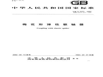 2—1985《梅花形弹性联轴器》进行的修订。本标准与GB/T5272--1985的主要不同之处是:贯彻执行了GB/T1.1--2000;每规格增加优选1推荐轴孔长度;增加了标记示例:取消了热塑橡胶,调整了弹性元件的硬度和材料;联轴器的质量和转动惯量按材料为铸钢、最小轴孔、L推荐计算;取消附录A“联轴器选用说明”和附录B“弹性件的材料”。本标准从生效之日起,同时代替GB/T5272—1985。本标准由全国机器轴与附件标准化技术委员会提出并归口。本标准起草单位:机械科学研究院、浙江仙居联轴器厂、浙江诸暨链条总厂。本标雄主要起草人:周明衡、王新华、明翠新、郭万松。254