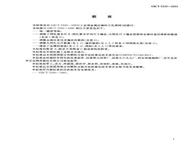 -调整金属丝直径及偏差的数值(见表3);一调整大网孔允许数量(见4.4)、编织缺陷(见4.6.3和表4)和网段长度(见表5);增加了金属网卷曲(见4.6.4)、网斜(见4.6.5)等的要求。本标准的附录A、附录B和附录C都是资料性附录。本标准由中国机械工业联合会提出。本标准由全国筛网筛分和颗粒分检方法标准化技术委员会(CSBTS/TC168)归口。本标准由机械科学研究院负责起草,国营第五四零厂、国营九六九九厂、西安西缆铜网厂、安平县安华五金网类制品有限公司参加起草。本标准起草人:余方、拜国强、郝庆学、贺永利、宋如轩、张勋、吴国川。本标准由全国筛网筛分颗粒分检方法标推化技术委员会秘书处负责解释。本标准所代替标准的历次版本发布情况为:-GB/T 5330—1985。