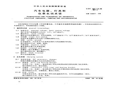 本标准规定了汽车电器(不包括蓄电池、火花塞及其他特种用途的电器)、灯具和仪表的名词、术语的定义,并用英语进行了对照。1 通用性术语 general terminology 标称电压 nominal voltage, basic system voltage1.1