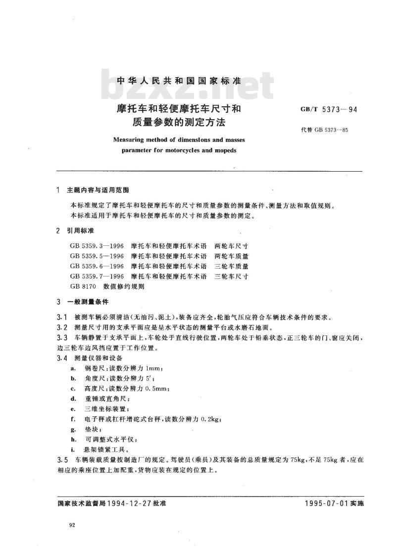 3.5车辆装载质量按制造厂的规定。驾驶员(乘员)及其装备的总质量规定为75kg,不足75kg者,应在相应的乘座位置上加配重,货物应装在规定的位置上。国家技术监督局1994-12-27批准92