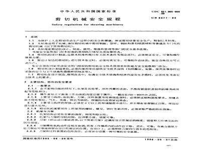 1.1为保护I.人在剪切劳动生产过程中的安全和健康,保证剪切设备安全生产,特制订本标准。1.2本标准适用于机械、液压剪切机械中剪切钢板、型材、钢坏和类似纸质材料等普通及专门化的剪切机械(以下简称剪切机)。