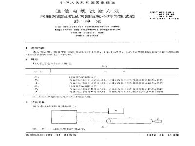本标准适用于用脉冲回波法测量2.6/9.5mm,1.2/4.4mm,0.7/2.9mm制造长度同轴电缆同轴对端阻抗和内部阻抗不均匀性。 GB 5441.4-1985 通信电缆试验方法 同轴对端阻抗及内部阻抗不均匀性试验 脉冲法 GB5441.4-1985 标准下载解压密码:www.bzxz.net