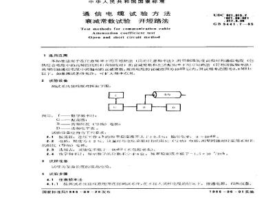 本标准适用于在任意频率下用开短路法(简称意频率法)测量制造长度高频对称通信电缆(包括综合电缆中的高频四线组利高频线对)的良减常数和在潜振顾率下州开短路法(简称谐搬频率法)测间轴通信电缆中司轴对的衰减常数。被测电缆的我减范[为10dB以内。测试频率范围为2.5MHz以下。如果测试条件允许,可人频率池割。2试验设备