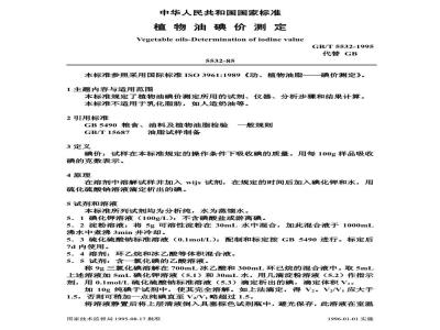 本标准规定了植物油碘价测定所用的试剂、仪器、分析步骤和结果计算。本标准不适用于乳化脂肪,如人造奶油等。 GB/T 5532-1995 植物油碘价测定 GB/T5532-1995 标准下载解压密码:www.bzxz.net