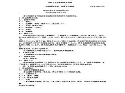 本标准适用于商品植物油脂判断其品质和纯度的试验。 GB/T 5539-1985 植物油脂检验 油脂定性试验 GB/T5539-1985 标准下载解压密码:www.bzxz.net