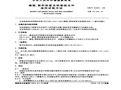 本标准规定了软管在充压条件下进行耐压性能、管体变形及爆破压力的测定方法。本标准适用于内径φ2~φ51mm的软管(包括软管组合件),不适用于特殊形状的软管。 GB/T 5563-1994 橡胶、塑料软管及软管组合件液压试验方法 GB/T5563-1994 标准下载解压密码:www.bzxz.net
