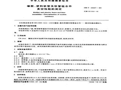 本标准规定了抽、吸用软管被抽空到规定的负压后,软管内、外表面形状变化的试验方法。本标准中的A法适用于内径为80mm及80mm以下的软管,B法适用于内径为80mm以上的软管。 GB/T 5567-1994 橡胶、塑料软管及软管组合件真空性能的测定 GB/T5567-1994 标准下载解压密码:www.bzxz.net
