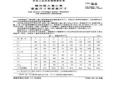 本标准规定了轴向吸人离心泵的底座和安装的基本尺寸。为适合于各种安装条件,本标准给出几种可自由选择的固定底座的孔的位置和数目。本标准主要适用于符合GB5662一85《轴向吸入离心泵(16bar)标记、性能和尺寸》的轴向吸入离心泵与机座带底脚的电动机相连接尺寸。其电机尺寸应符合JB3074一82《Y系列(IP44)三相异步电动机技术条件(H80~280毫米)》的规定。其他型式泵如合适亦可采用本标准。本标准等同采用国际标准IS036611977《轴向吸入离心泵底座尺寸和安装尺寸》。底座号和尺寸应符合图和表1的规定。基本安装尺寸应符合表2的规定。其底座尺寸根据泵尺寸标记和对应的电动机机座号由表2查出底座号。然后,再由表1查得该底座号的尺寸。表 1底座号和尺寸