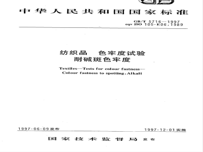 本标准规定了一种方法以测定各类纺织品的颜色耐稀碱溶液的能力。 GB/T 5716-1997 纺织品 色牢度试验 耐碱斑色牢度 GB/T5716-1997 标准下载解压密码:www.bzxz.net