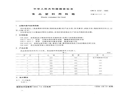 本标准规定了食品塑料周转箱的产品分类、技术要求、试验方法、检验规则及标志、包装、运输、贮存。本标准适用于以聚烯烃塑料为原料,采用注射成型法生产的无内格的食品箱。 GB/T 5737-1995 食品塑料周转箱 GB/T5737-1995 标准下载解压密码:www.bzxz.net
