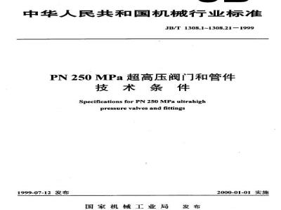 JB/T 1308.21-1999 本标准是对 JB 1328-73《Pg(2500kgf/cm2)弯管 型式、尺寸和技术要求》的修订。 本标准规定了超高压阀门用弯管型式、尺寸和技术要求等。 本标准适用于公称压力 250MPa 的乙烯、聚乙烯等中性介质的弯管。 本标准于 年 月 日首次发布。 JB/T 1308.21-1999 PN250a 弯管型式、尺寸和技术条件 JB/T1308.21-1999 标准下载解压密码:www.bzxz.net