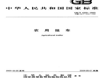 本标准代替GI3/T4330—1984用挂车》。本标准与GB/T4330-1984捐比,主要技术内容改变如下:增加了安全技术要求,与GB72581997有关规定协调一致:一删除了主要零部件的尺寸、材料等方面技术要求一增加了验收规则,标志、包装、运输和贮存的内容-一调整了一般技术要求的内容。本标准由中国机械工业联合会提出,本标准由全国农业机械标准化技术委员会归口。本标准起草单位:中国农业机械化科学研究院、国家农机具质量临督检验中心.江南运输机械有限公司。