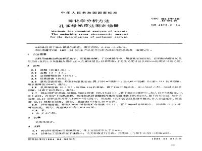 Methods for chemical analysis of arsenicThe malachite green photometric methodfor the determination of antimony content本标准适用于砷中锑量的测定。测定范围:0.010~0.450%。UDC 669.778 : 543