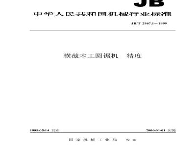 JB/T 2967.1-1999 本标准非等效采用不着ISO 7008《带或不带移动工作台单锯片木工圆锯机 术语与验收条件》中相应的检验项目。 本标准是对 JB 2971-84《横截木工圆锯机 精度》的修订,修订时仅按有关规定作了编辑性修改,技术内容未改变。 本标准规定了横截木工圆锯机的几何精度和工作精度要求及检验方法。 本标准适用于锯片直径在 315~1000mm 的手动进料单锯片横截木工圆锯机。 本标准于是 1984 年 2 月 11 日首次发布。 JB/T 2967.1-1999 横截木工圆锯机 精度 JB/T2967.1-1999 标准下载解压密码:www.bzxz.net
