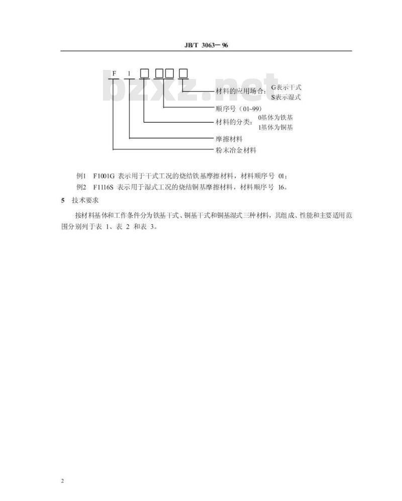 例1F1001G表示用于干式工况的烧结铁基摩擦材料;材料顺序号01;S表示用于湿式工况的烧结铜基摩擦材料,材料顺序号16。例2