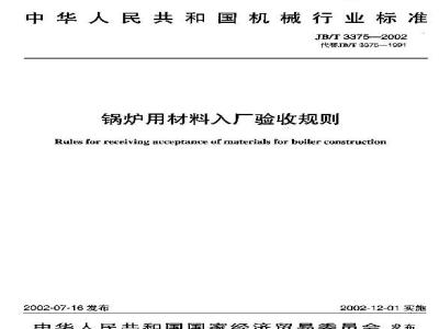 本标准代替拍T3375—1991锅炉原材料人,厂检验3本标准与JD/T3375—199[相比,主要变化如下:…外充了人厂验收和有关术语的定义(本版的第3查,:规定了人厂验以站月的确定原则(191年版的第3章;本版的第4章):JB/T3375—2002