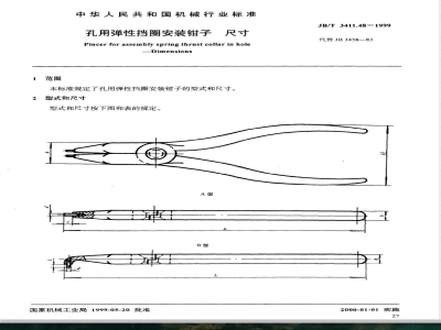 JB/T3411.48-1999 本标准是对 JB 3458-83《孔用弹性挡圈安装钳子 尺寸》的修订,修订时只作了以下几点修改,主要技术内容未改变: ——编写格式; ——标准名称加英文; ——螺纹的画法。 本标准规定了孔用弹性挡圈安装钳子的型式和尺寸。 JB/T 3411.48-1999 孔用弹性挡圈安装钳子 尺寸 JB/T3411.48-1999 标准下载解压密码:www.bzxz.net