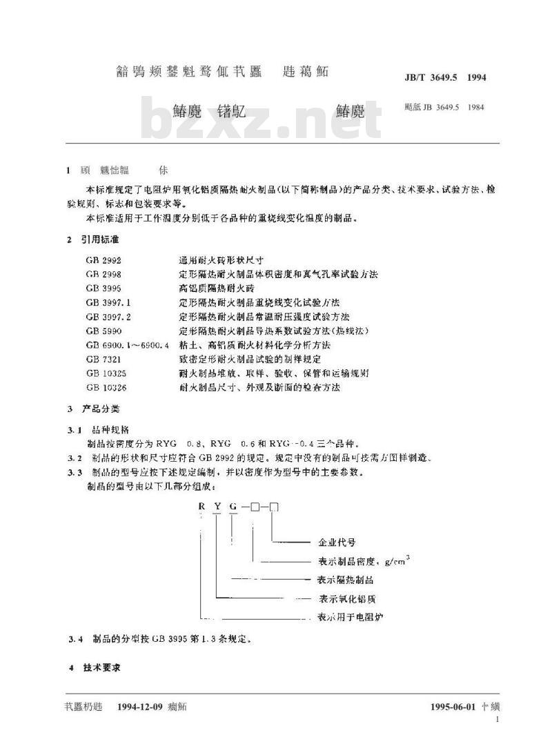 致密定形耐火制品试验的制样规定耐火制品堆放,取样、验收、保管和运输规则耐火制品尺寸、外观及断面的检查方法制品按密度分为RYG0.8、RYG0.6和RYG·-0.4三~品种。3,2制品的形状和尺寸应符台GB2992的规定。规定中没有的制品可接需方图样制造3.3制品的型号应按下述规定编制,并以密度作为型号中的土要参数。制品的型号由以下几部分组成:R