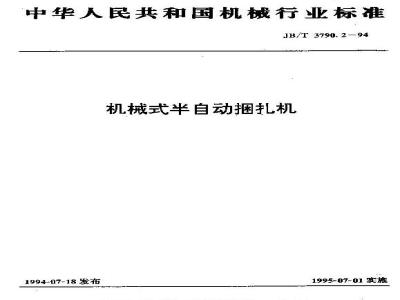 本标准代替JB 3790-84部分。 本标准规定了机械式半自动捆扎机的术语、型式和基本参数、技术要求、试验方法、检验规则以及标志、包装、运输、贮存。 本标准适用于以机用塑料打包带作为捆扎材料,接头型式为热熔搭接的机械式半自动捆扎机。