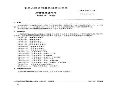 本标准规定了冷镦GB5780~5786六角头螺栓M3~M12,GB70内六角圆柱头螺钉M4~M12及GB65~~69.GB818~~820螺钉M2~~M10A型切料刀的结构型式与尺寸、技术要求和标记。本标准适用于双击整模自动冷镦机和多工位自动冷机的模具。2引用标准