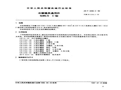 本标准规定了冷镦GB5780~5786六角头螺栓M5~M20及GB70内六角圆柱头螺钉M5~M20C型切料刀的结构型式与尺寸、技术要求和标记。本标准适用于多工位自动冷镦机的模具。2引用标准