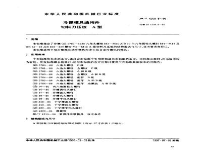 本标准规定了冷锻GB5780~~5786六角头螺栓M3~~M20,GB70内六角圆柱头螺钉M4~M16及GB65~69,GB818~820螺钉M2~M12A型切料刀压板的结构型式与尺寸、技术要求和标记。本标准适用于双击整模自动冷镦机和多工位自动冷镦机的模具。2引用标准